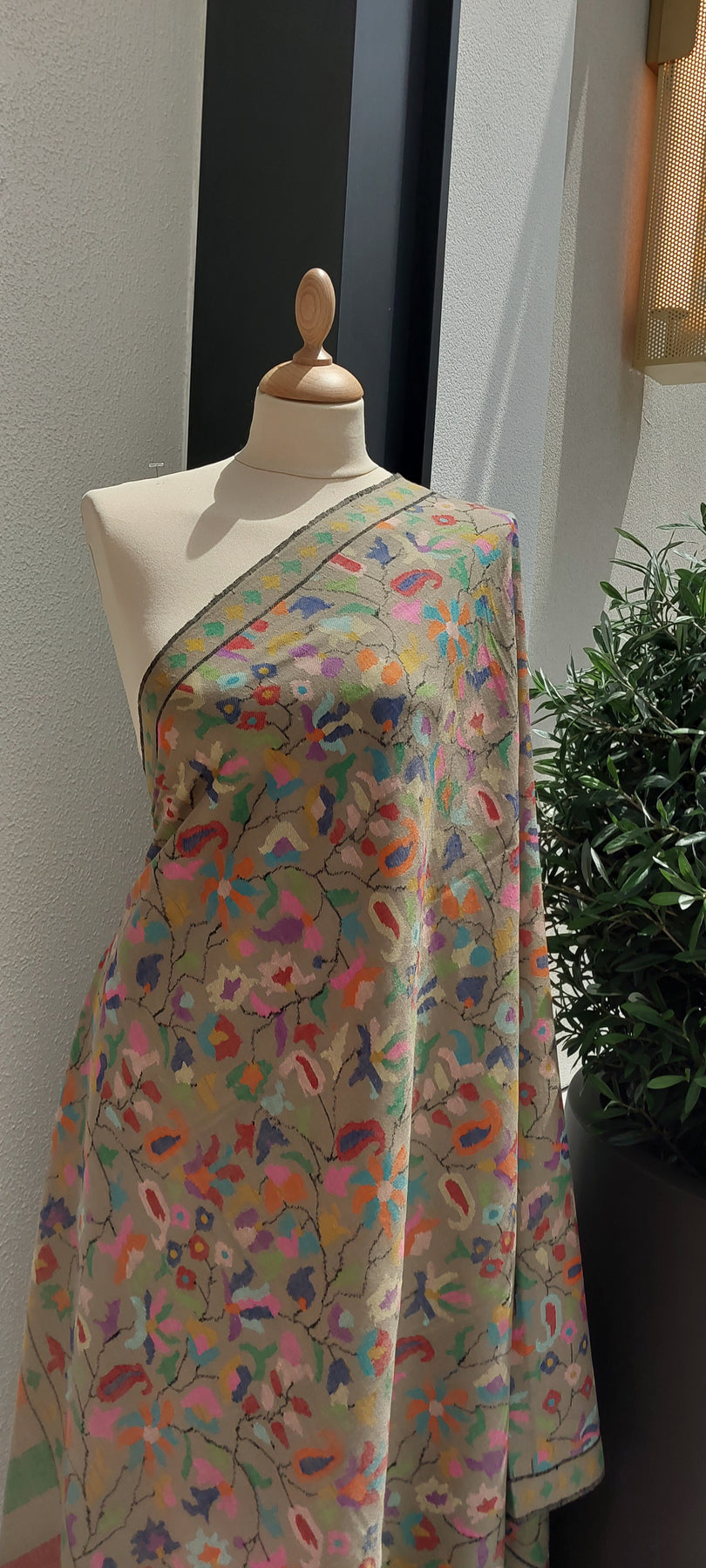 It is hand-woven by traditional artisans in Kashmir, and a work of wearable art. The entire design is conceptualized in the weave upon the loom. Our shawls drape beautifully, and a kaani shawl is stunning whether you’re sipping tea at a garden party or staying stylish, yet cozy at a winter wedding.