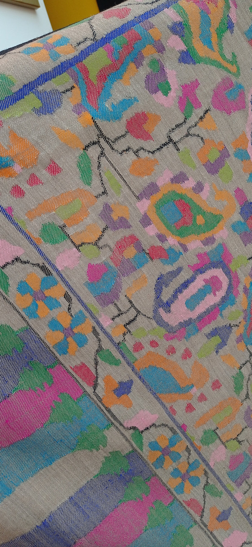 Our Emaan light grey Kashmiri kani shawl is ideal for an evening pashmina. Its palette of blues, purple, green and pink are tinged with a pop of magic that adda mirth to this ensemble.