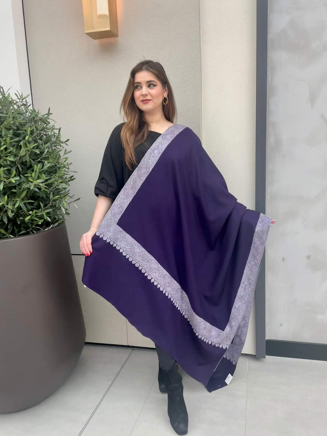 Faizan Royal Purple Pashmina Shawl With Embroidered Borders | House of Inaayat