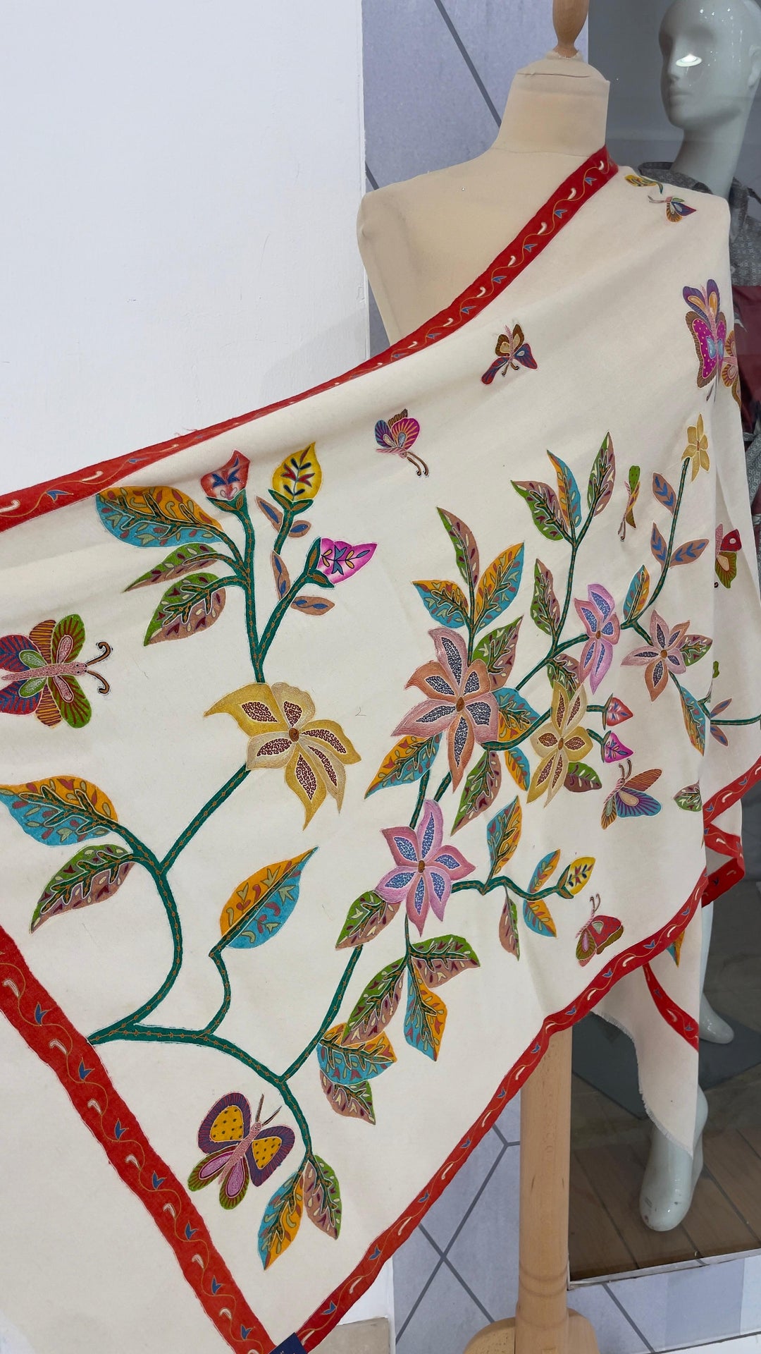 Shipra Ivory Floral Hand-Embroidered Pashmina Scarf | House of Inaayat