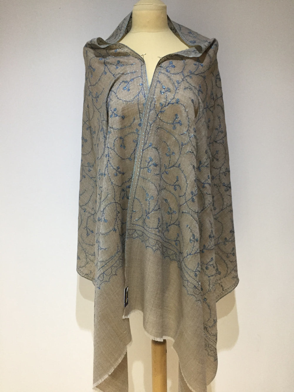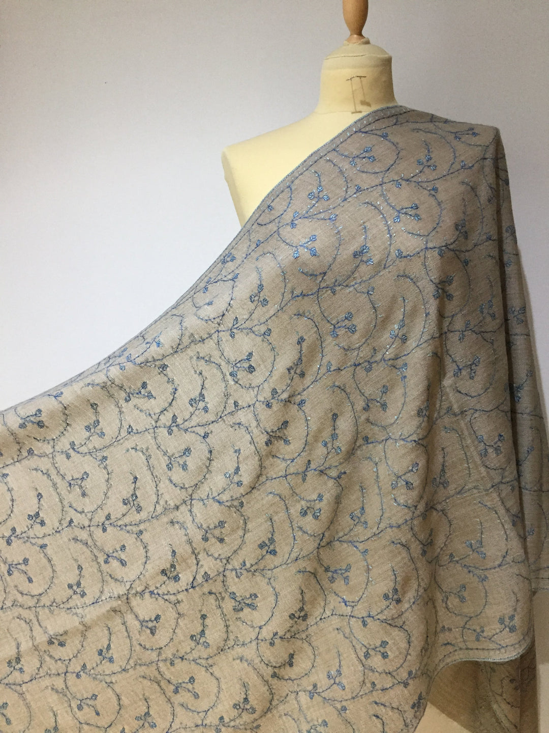Ishrat Natural Grey Embroidered Pashmina Stole | House of Inaayat